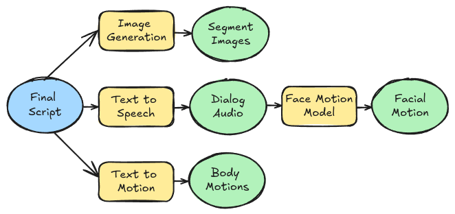 This phase incorporates several passes of different LLMs to produce a structured “script”. This includes breaking the show into segments, determining dialog for the character, dictating body motion, timing for sound effects and more.