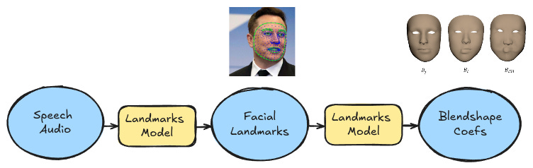 Given the generated speech and text, we need to generate a set of corresponding facial positions for the speaker. 3D character facial positions can be represented as a set of blendshape coefficients. We can follow a two-stage process to generate these from speech audio: