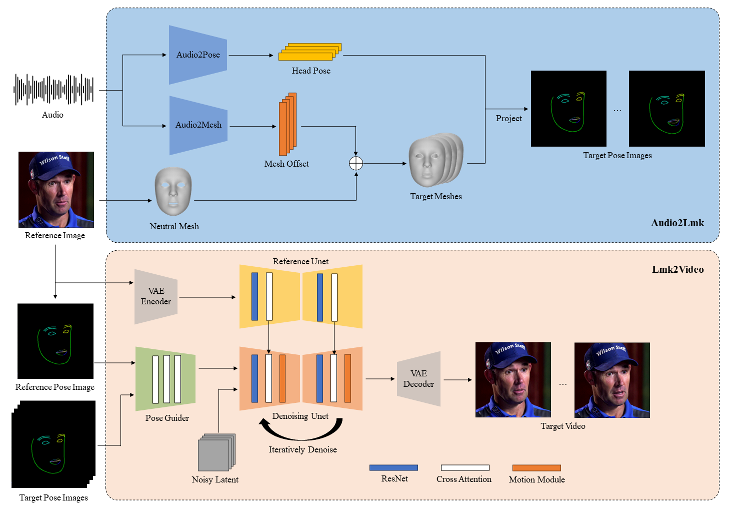 For speech-to-facial-landmark generation I spliced out the first half of a video-to-video model, AniPortrait. (Pictured in blue below.)